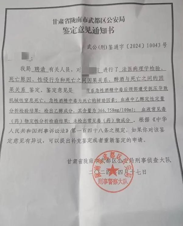 根据王女士提供的警方尸检报告显示,甘肃省陇南市武都区公安局对小霞进行了法医病理学检验、死亡原因、性侵行为和死亡之间因果关系、醉酒与死亡之间的因果关系鉴定。鉴定意见是为,小霞系急性酒精中毒后颈部遭受扼压导致机械性窒息死亡,急性酒精中毒为死亡的辅助因素。